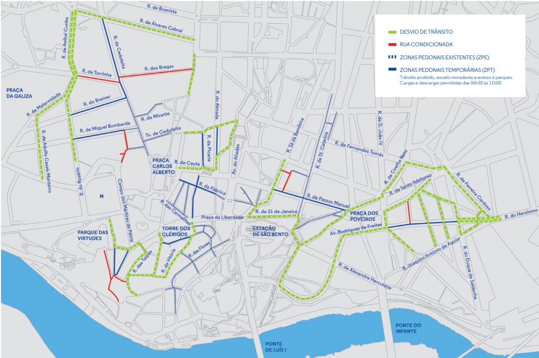 On the map of the temporary pedestrian zones, keep abreast of traffic detours and restrictions in various locations in the centre of Porto.